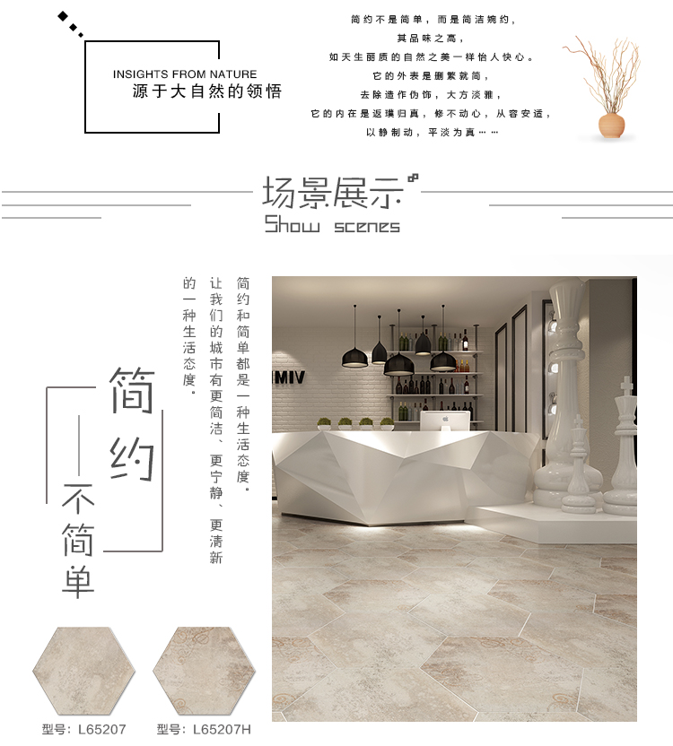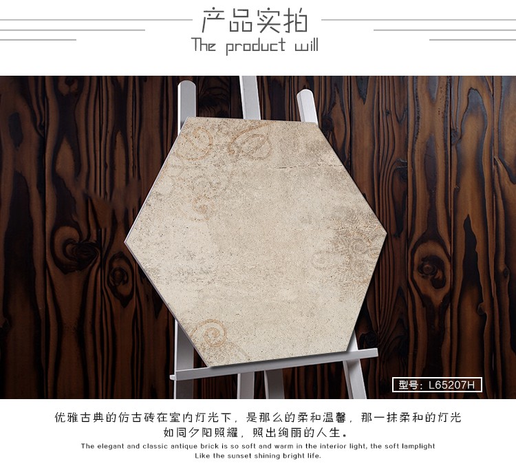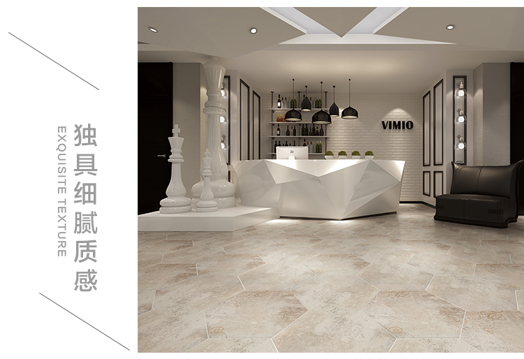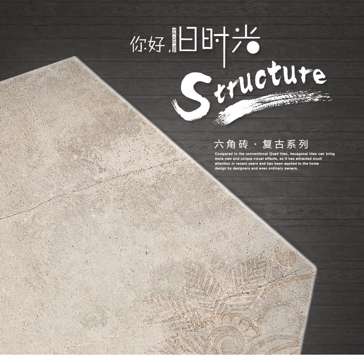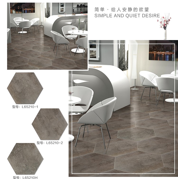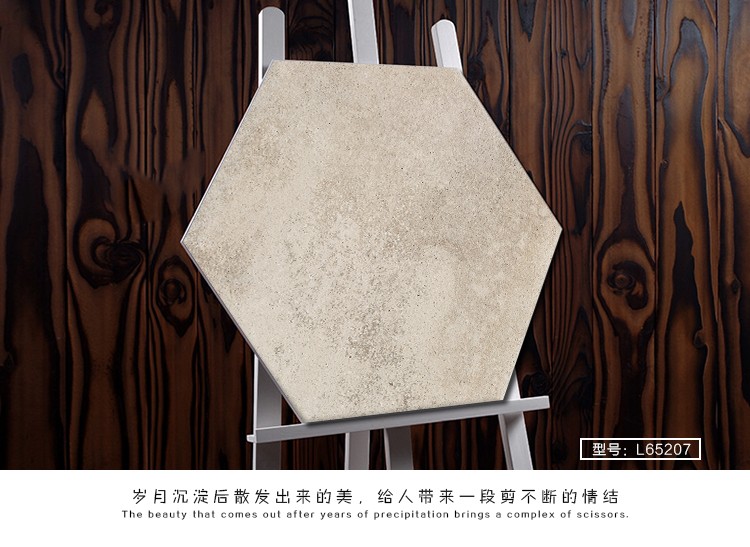 金曼古瓷磚廠家六角磚是一種表面呈現木紋裝飾圖案的環保建材.紋路逼真、自然樸實、沒有木地板褪色、不耐磨等缺點;曼古陶瓷木紋磚系列線條明快,圖案清晰為特色。本身具有阻燃,不腐蝕的特點,綠色、環保型建材;產品使用壽命長,耐磨,無需像木制產品那樣周期性地打蠟保養等。